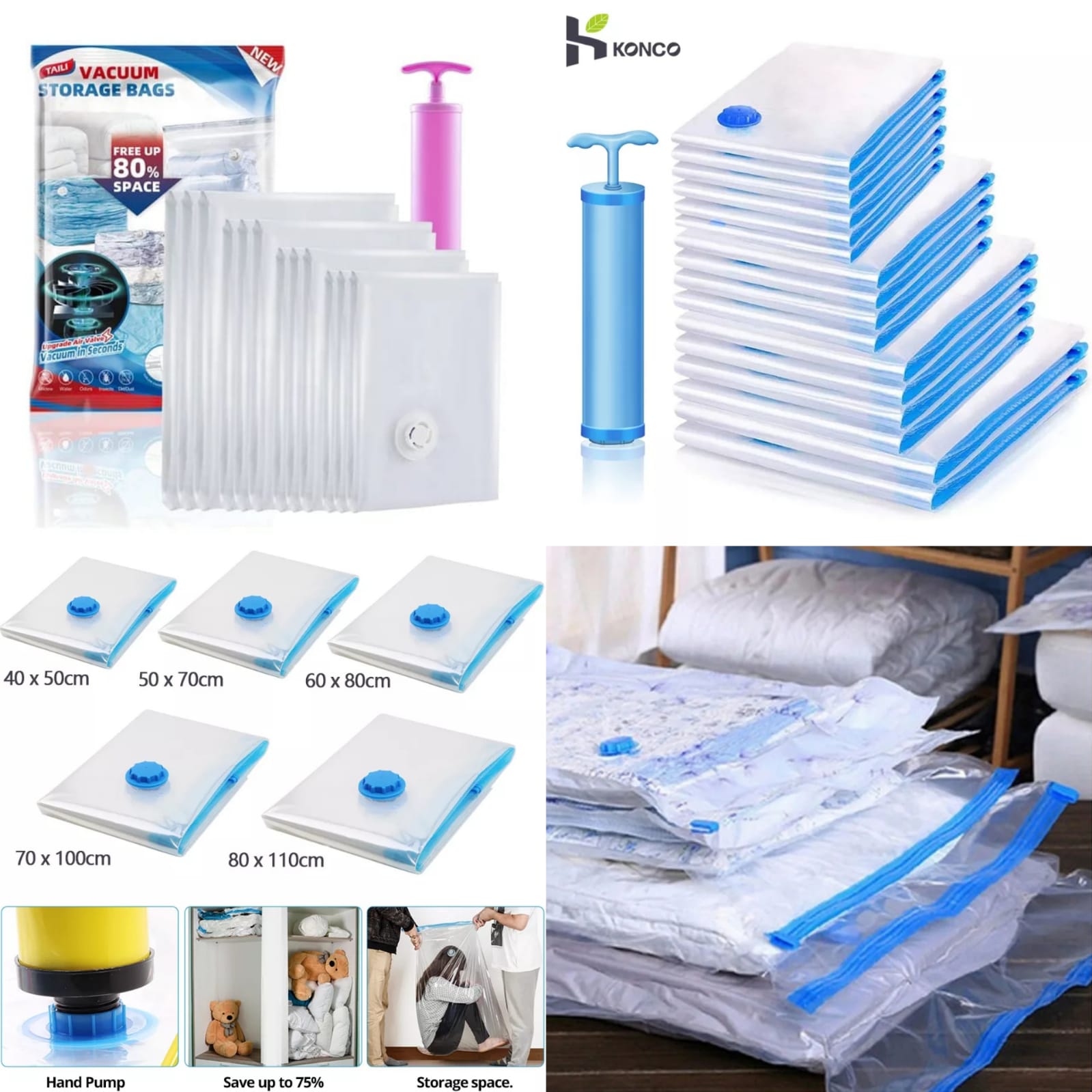 A complete vacuum storage set designed to save up to 75% space. Perfect for clothes, bedding, and travel packing, with waterproof bags in multiple sizes and a manual pump for easy compression anywhere.