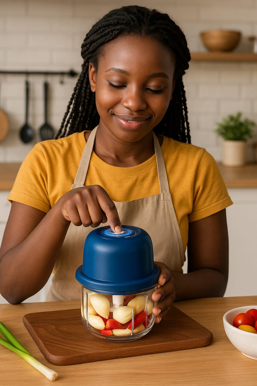 A handy mini electric chopper designed to quickly chop garlic, vegetables, meat, and baby food. USB rechargeable, compact, and made with durable stainless steel blades and a plastic shell.