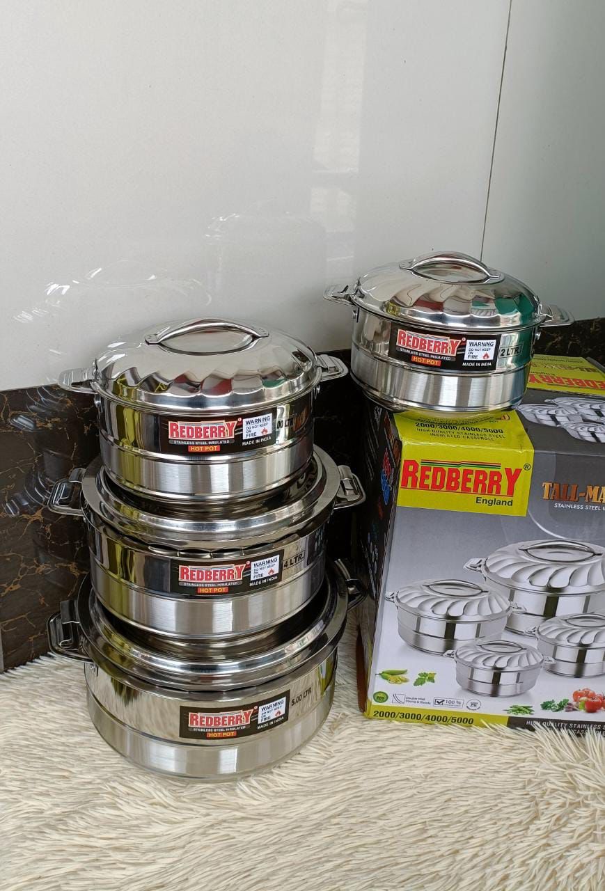 A premium set of tall, insulated stainless steel Redberry hot pots designed to keep food hot and fresh for extended periods. Perfect for home use, events, and serving large families.